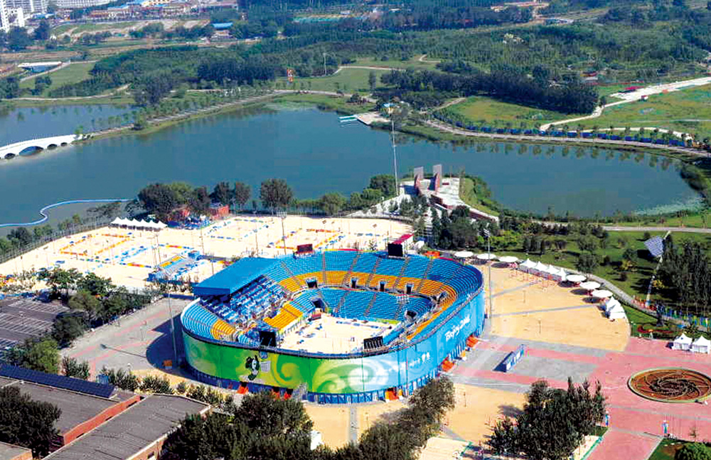 朝阳公园沙滩排球场为2008年北京奥运场馆工程,位于北京市朝阳区朝阳公园内,整个工程由以下项目组成:一座12000座位的比赛临时场馆、两块热身场地,其中一块配200座位的媒体专用席位、六块训练场地、三座既有建筑物改造工程、室外广场、道路硬化、市政管线等,工程包括2万㎡人造沙滩和7万㎡广场地面块材铺设。河北省第四建筑工程有限公司施工总承包。